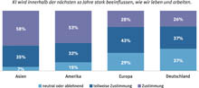 Die Ergebnisse zeigen landesspezifische Unterschiede. So bewerten 58 Prozent der Studienteilnehmer aus dem asiatischen Raum, dass Künstliche Intelligenz unser (Arbeits-)Leben in den kommenden zehn Jahren stark verändern wird. In Amerika sind es immer noch 53 Prozent. In Europa liegt der Wert bei lediglich 28 Prozent. Am größten ist die Skepsis KI gegenüber in Deutschland, wo nur knapp jeder Vierte einen bedeutsamen Wandel durch den Einsatz von KI erwartet.