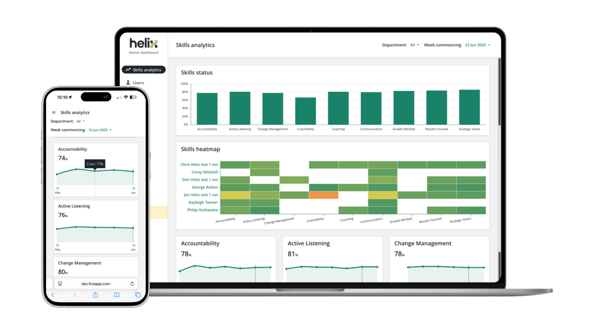 Helix can be used as a standalone product, or used seamlessly with the existing 5app LMS, alongside the VeeCoach AI tutor agent, supporting identified growth opportunities with targeted learning content and coaching interventions.