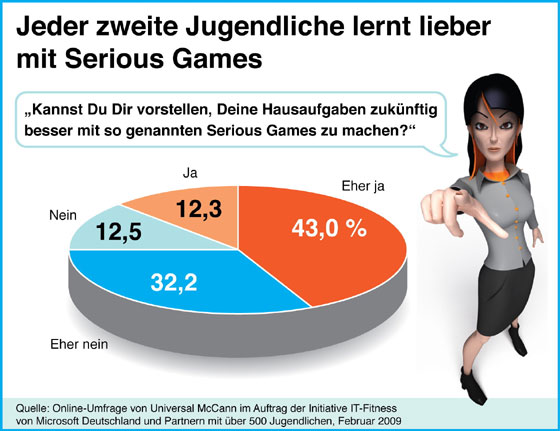 Zum Start des Serious Games "Agent Attack IT" veröffentlichte die Initiative ITFitness von Microsoft Deutschland und Partnern eine Online-Studie zum Thema. Befragt wurden über 500 Jugendliche im Alter von 14 bis 19 Jahren. Fast jeder dritte Jugendliche spielt demnach schon jetzt Rate- und Wissensspiele. Sie sind vor allem bei Mädchen beliebt.
