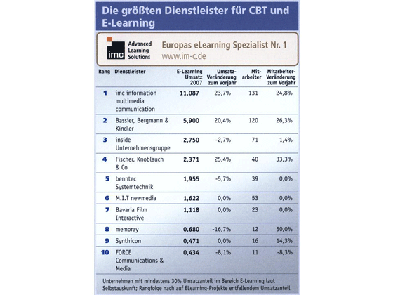 Saarbrücken, April 2008 - Die IMC AG hat beim 9. New Media Service Ranking einen Sprung nach vorn gemacht. In der Kategorie "Größte Dienstleister für CBT und eLearning" gelang es ihr, sich an die Spitze zu setzen. Im Vorjahr hatte sie Platz zwei belegt. In der Gesamtbewertung konnte sich die IMC AG nach Rang 15 im Vorjahr fünf Plätze weiter vorn und damit erstmals in den Top Ten platzieren.