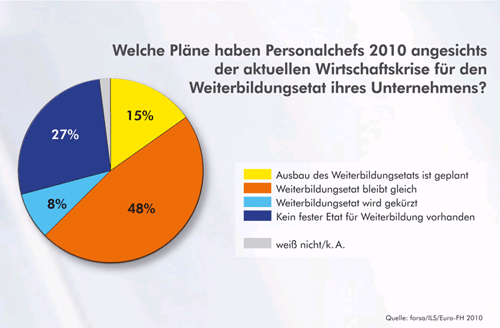 Hamburg, Februar 2010 - Trotz anhaltender Wirtschaftskrise kennen Arbeitgeber den Wert von betrieblichen Qualifizierungsmaßnahmen für den Unternehmenserfolg: 2010 wollen daher 48 Prozent der Betriebe in Deutschland mit mehr als 150 Mitarbeitern ihren Weiterbildungsetat unverändert zum Vorjahr beibehalten - 15 Prozent planen sogar, ihr Budget für Fortbildungen weiter auszubauen. Dies ist das Ergebnis der repräsentativen forsa-Studie unter Personalverantwortlichen im Auftrag des ILS Institut für Lernsysteme und der Europäischen Fernhochschule Hamburg (Euro-FH), deren Ergebnisse jetzt vorliegen.